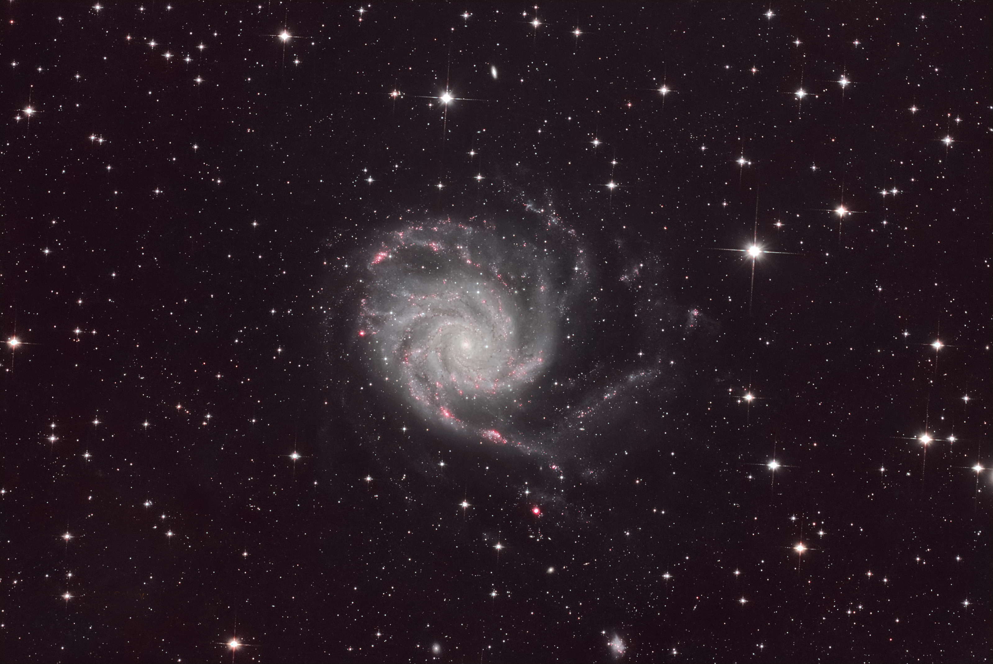 Messier 101 oder M101 ist eine Spiralgalaxie im Sternbild Großer Bär. Sie wird auch als Feuerradgalaxie (englisch Pinwheel Galaxy) bezeichnet. Sie gehört zu den Galaxien auf die wir fast senkrecht draufschauen. Sie ist ungefähr so groß wie unsere Milchstraße. Die Entfernung zur Erde beträgt rund 22 Millionen Lichtjahre, ihr Durchmesser 170.000 Lichtjahre. In der o.a. Aufnahme sieht man zahlreiche pinkfarbene Sternentstehungsgebiete.