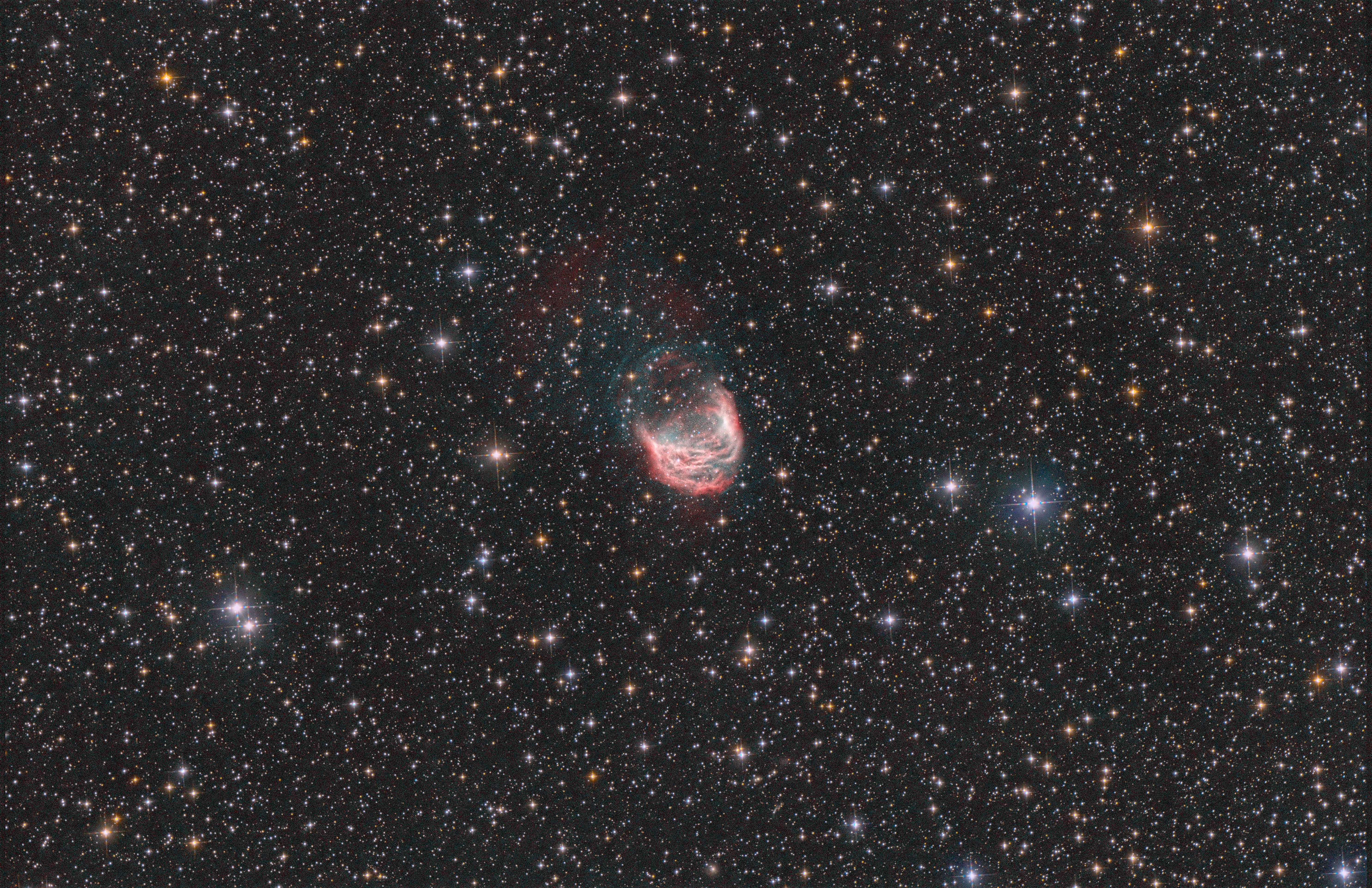 | Belichtung: | RGB 40 * 180s =7.200 s = 2h Ha+OIII 60 * 300s =18.000 s = 5h Ha+OIII 20 * 360s =7.200 s = 2h |