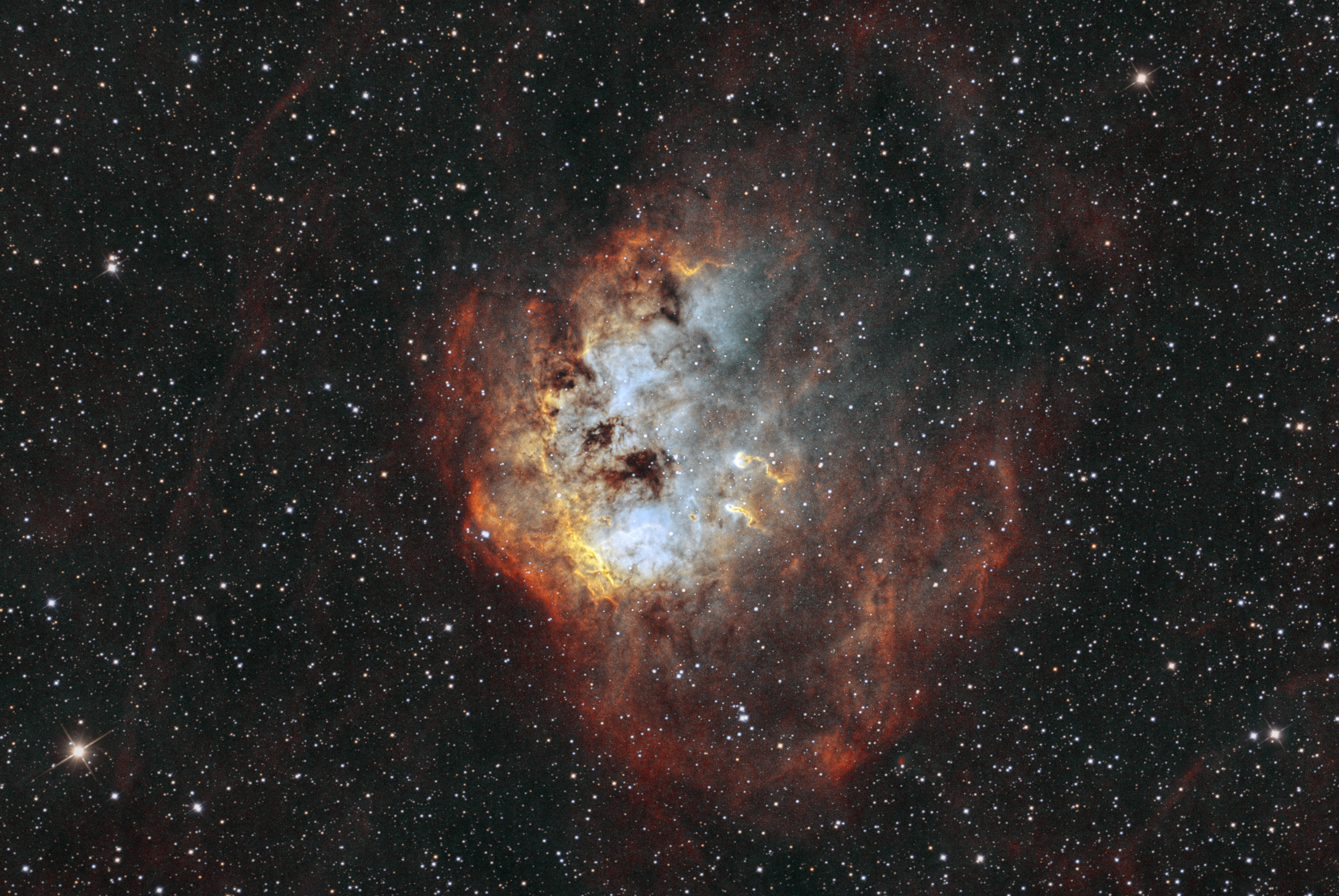 | Belichtung: | 65 * 5m = 5.4h –> HaO3 80 * 3m = 4h. –> RGB |